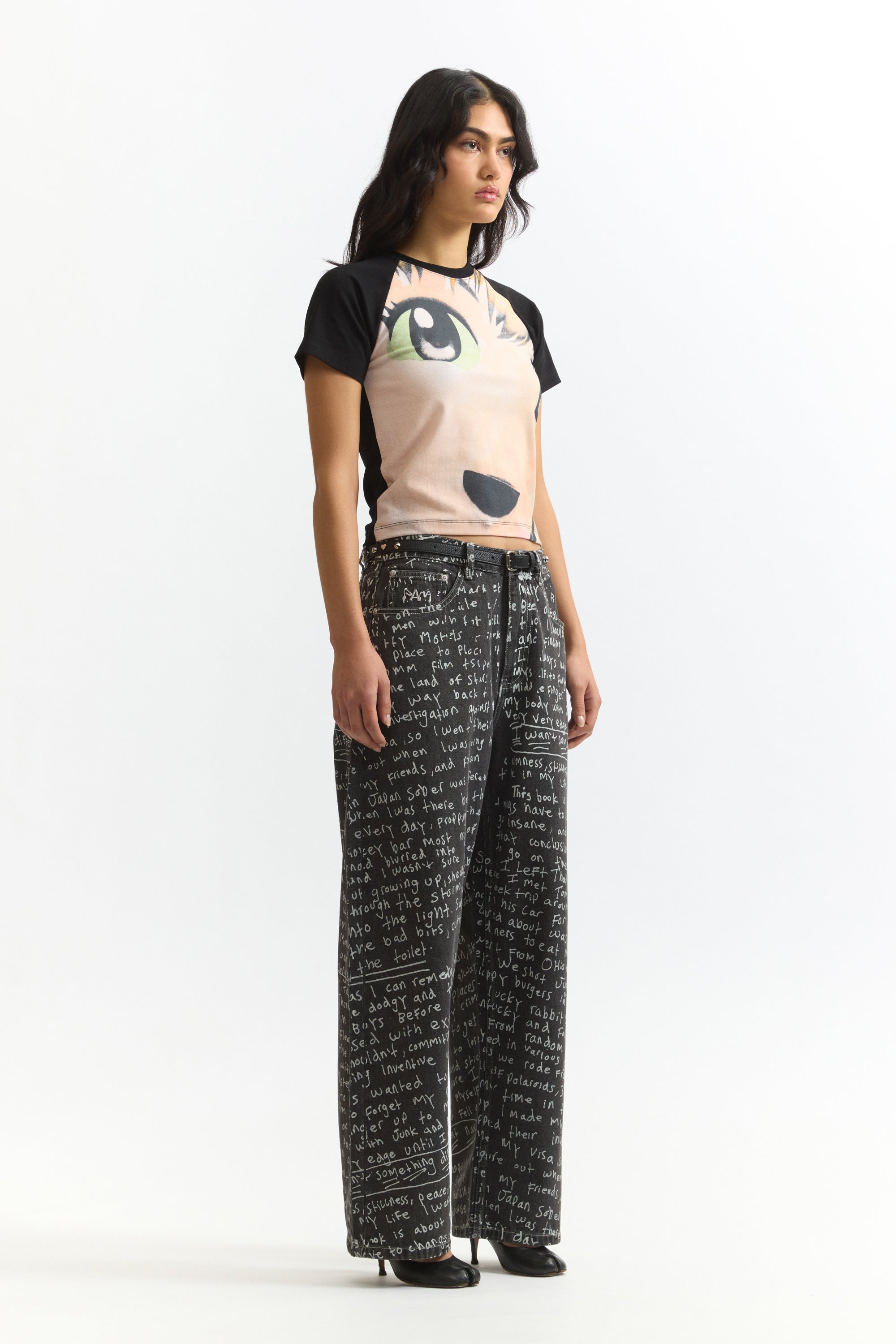 - Small eyes folded label at back hem.